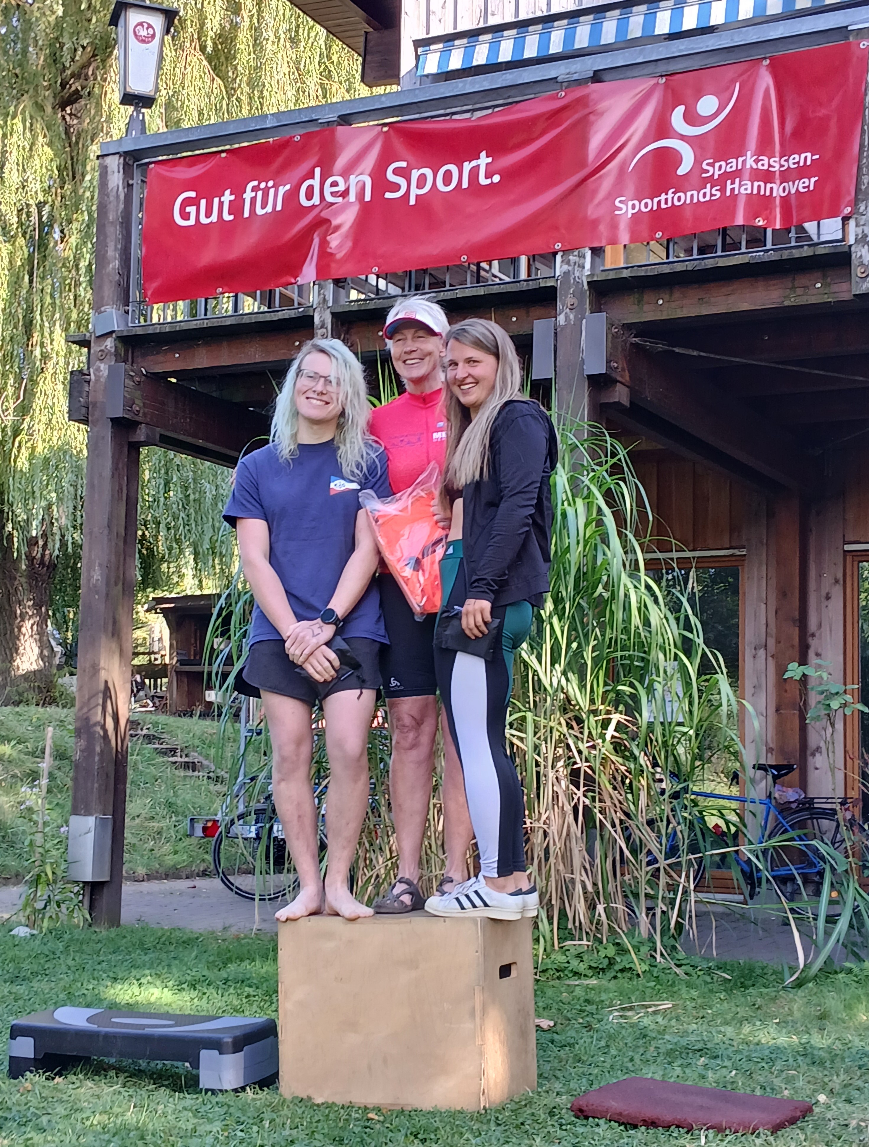 Das Frauenpodium wurde von Gabi Menke angeführt, mit Abstand zu Tabea Harst, die allerdings einen aufregenden Start durch Bundesbahnverspätungen und vergessenem Paddel in der Bahn zu bewältigen hatte. Ergänzt wurde das Podium durch Lisa Büthe vom WVC, die gerade ihre erste Saison im Quadrathlon hinter sich bringt.